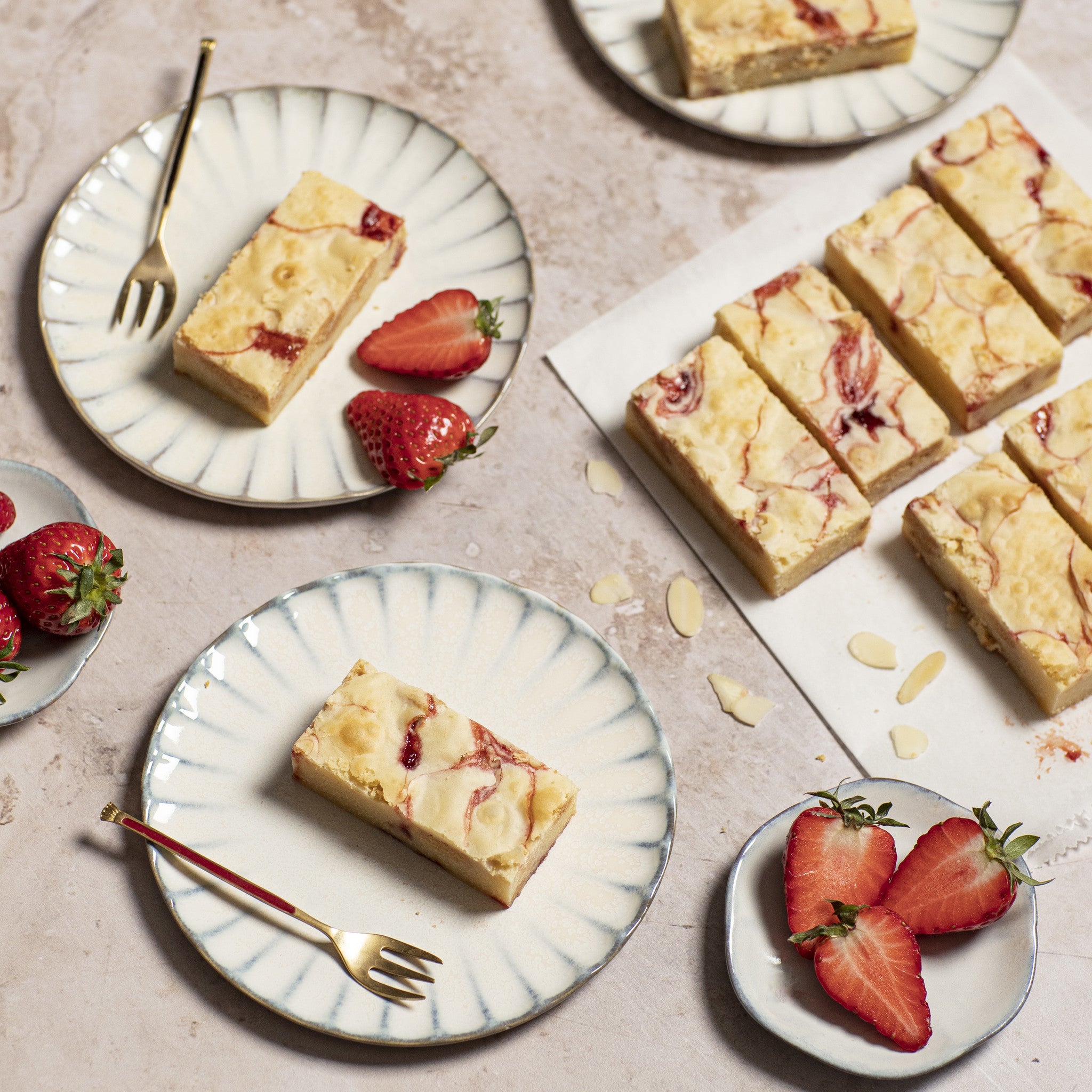 Zijn het geen pareltjes? Deze zomerse Aardbeien Blondies vol met liefde. De Aardbeien Blondie is gevuld met amandelkoekjes en met een swirl van aardbeien. Weer zo'n meesterwerk van het Brownie-ontwikkelteam!