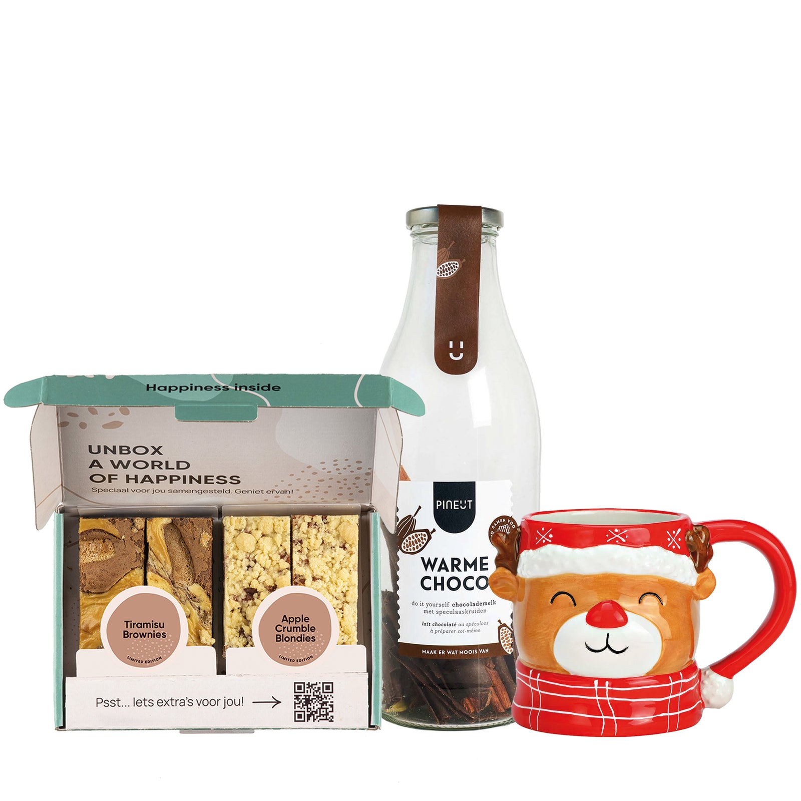 DIY Warme Chocomel van Pineut, een box vol heerlijk Tiramisu brownies en Apple Crumble blondies, en een superschattige kerstmok.