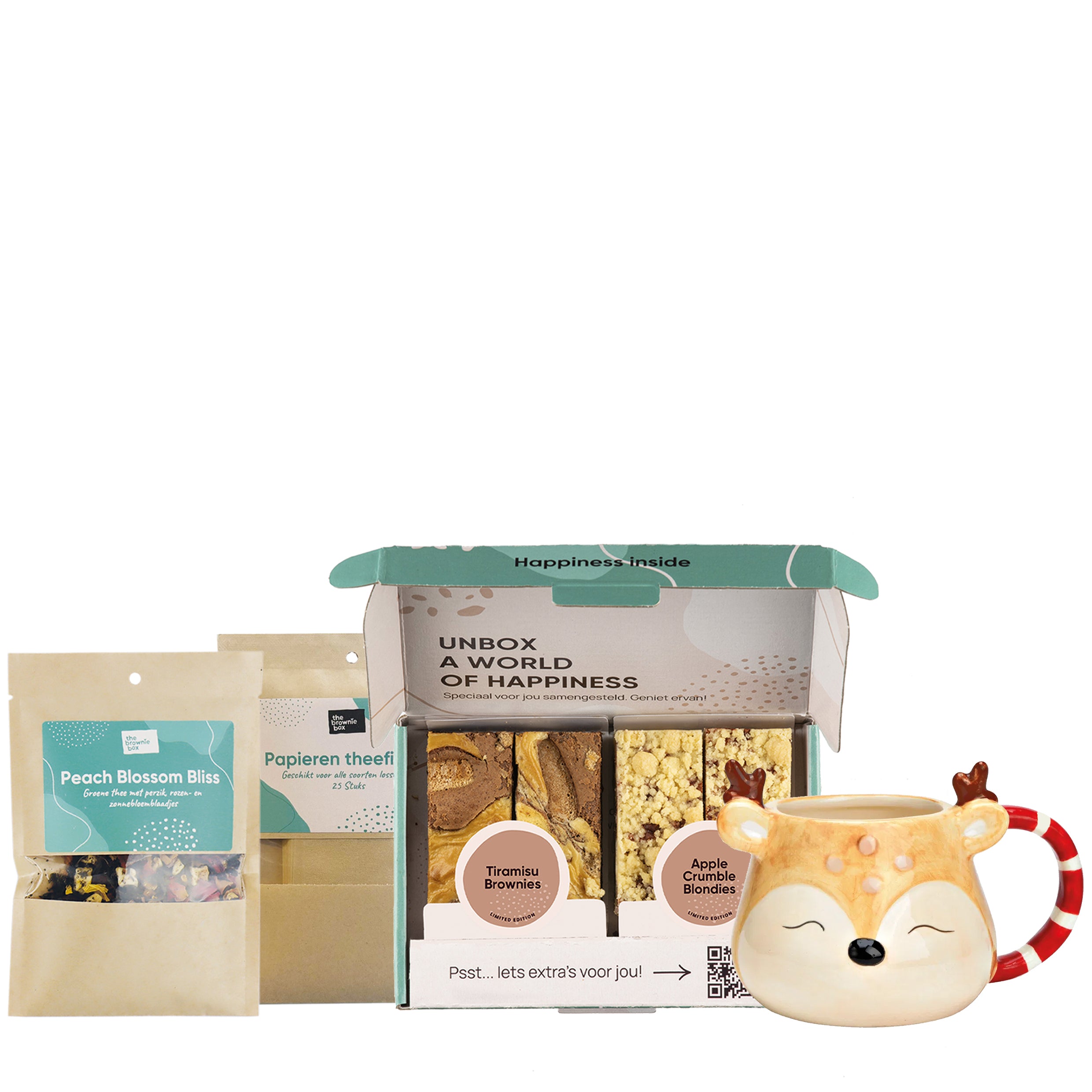 In dit pakket zit een browniebox met 2 Tiramisu Brownies en 2 Apple Crumble Brownies, een leuke rendier kerstmok en heerlijke Peach thee met theefilters.