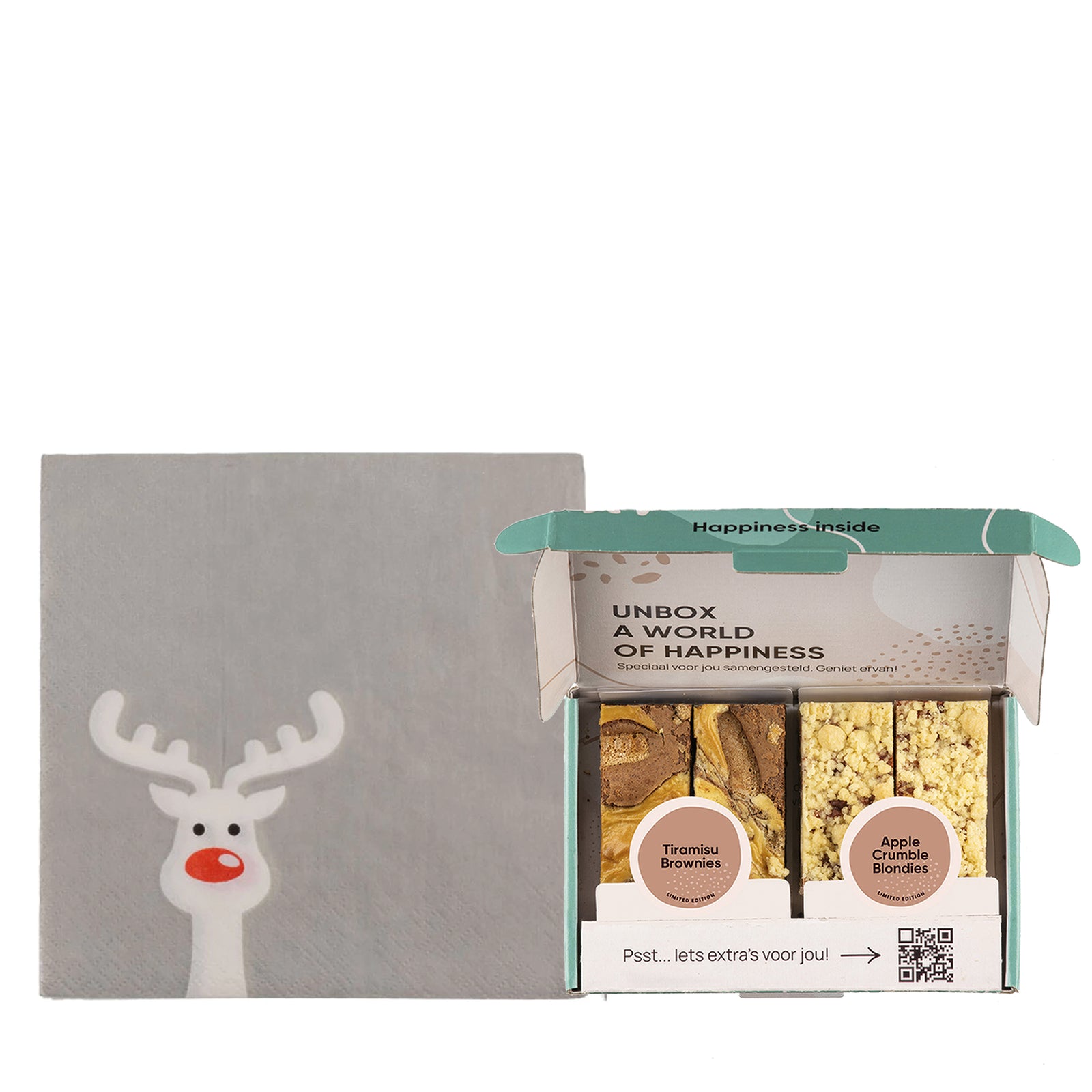 Kerstig genieten met deze leuke kerstbox! Een box gevuld met heerlijke Tiramisu brownies, Apple Crumble blondies en feestelijke Kerstservetten. Genieten gegarandeerd!
