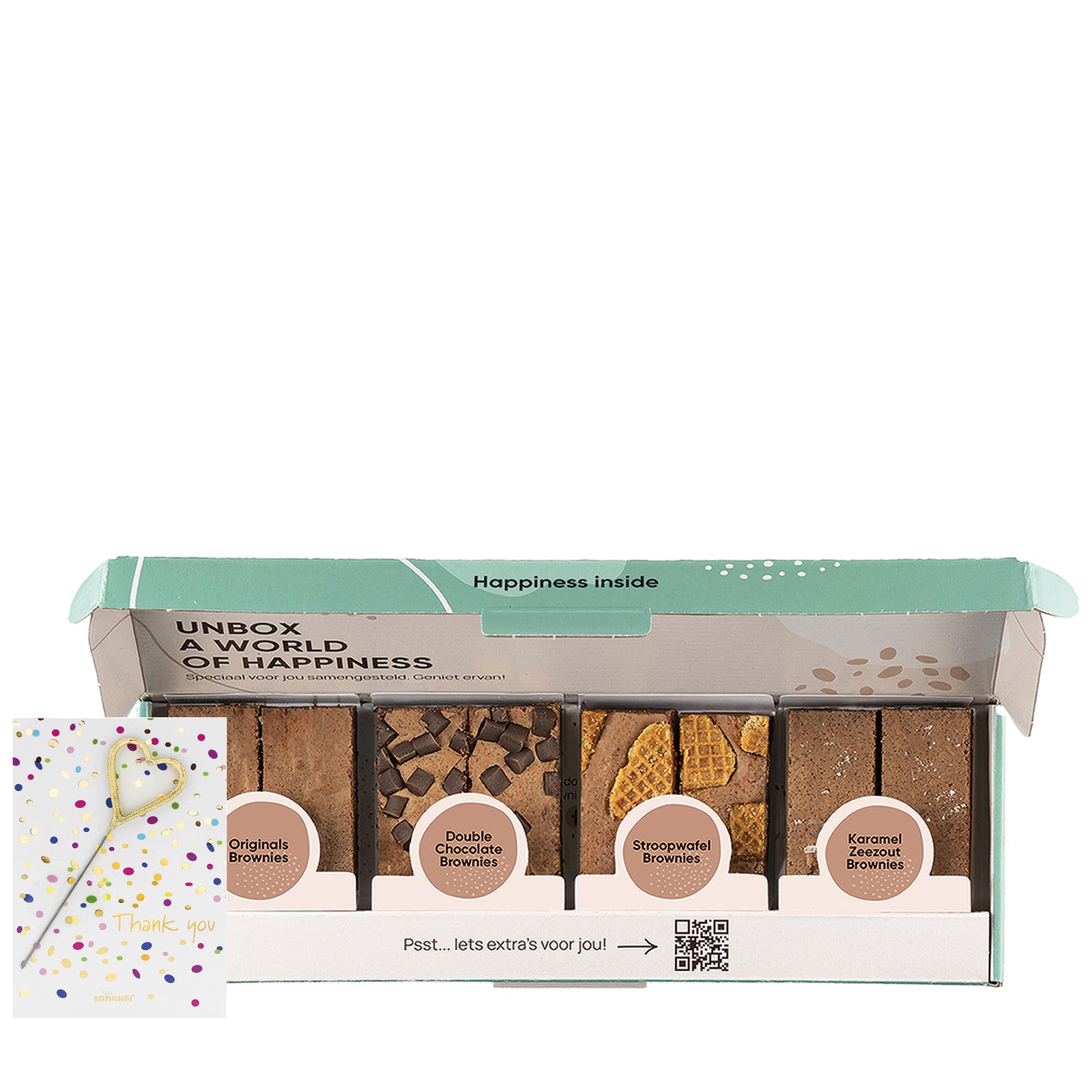 Bedank iemand op een verrassende manier met verse handgemaakte brownies, compleet met sprankelende wondercard met tekst 'Thank You' en een aansteekbaar hartje. Om welke reden jij iemand ook dankbaar bent, met dit persoonlijke brievenbuscadeau laat je jouw dankbaarheid op een bijzondere manier zien!