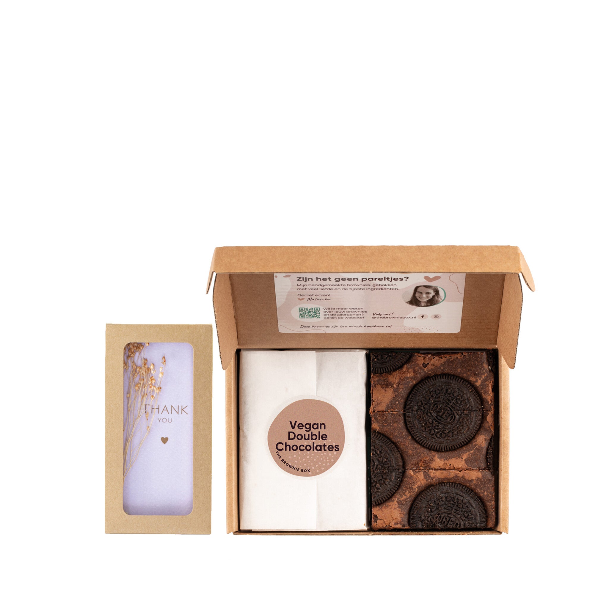 Gezellig genieten van dit leuke brievenbuscadeautje! Gevuld met heerlijke vegan brownies en lief geschenkdoosje met kaartje en droogbloem in mini kleistandaard.