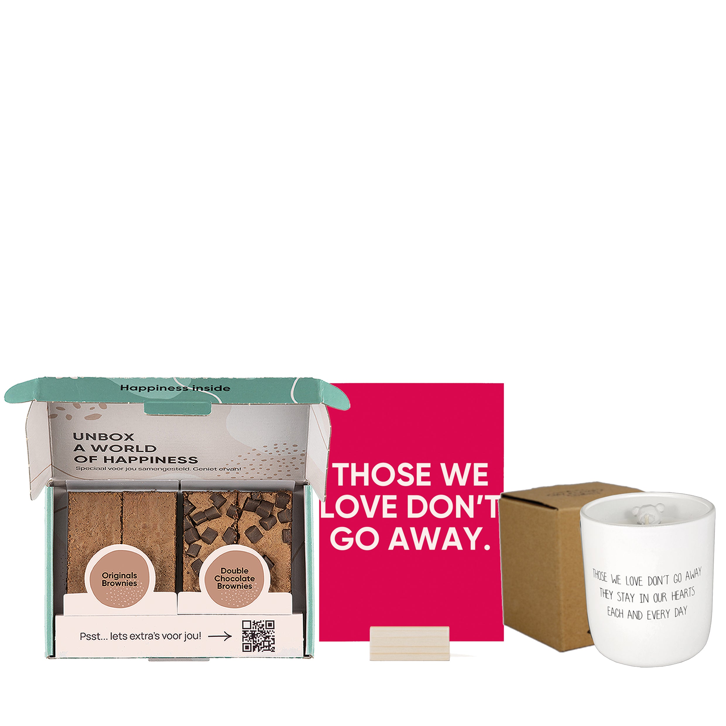Soms zijn er geen woorden die het zeggen kunnen. Deze cadeaubox is een liefdevol gebaar om te laten merken dat je aan iemand denkt, om een moment van troost te brengen en te herinneren dat degenen van wie we houden nooit echt weggaan. Een klein lichtpuntje in een moeilijke tijd, met warmte en aandacht verpakt.