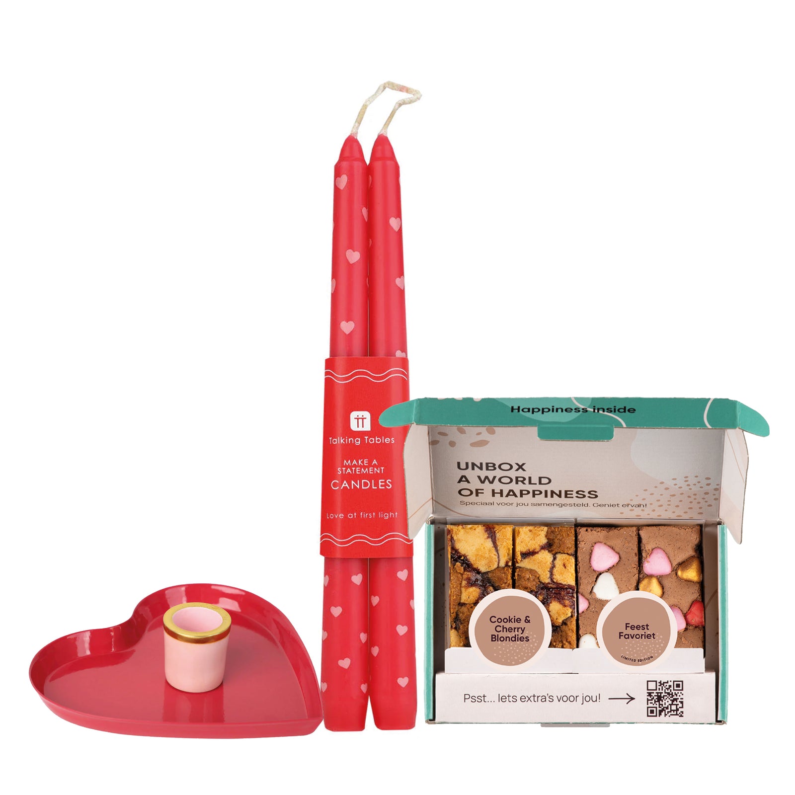 Zoek jij nog een Valentijnscadeau voor de allerliefste? Zoek niet verder en kies voor deze cadeaubox met heerlijke brownies, een schattige hartjeskandelaar en lieve hartjeskaarsen. Het perfecte cadeau voor jouw allerliefste Valentijn.
