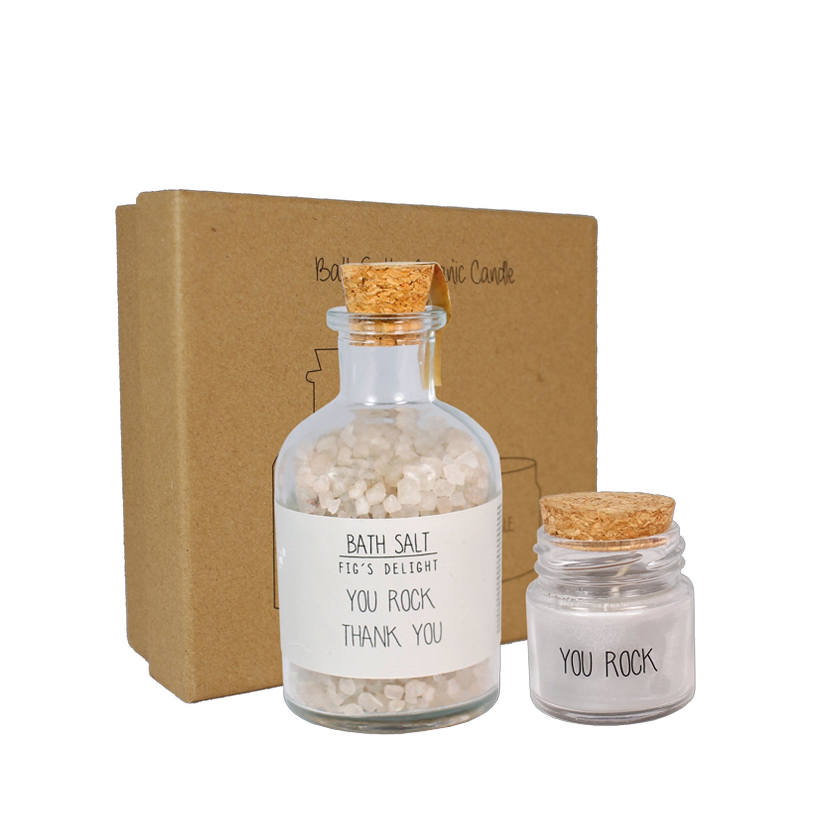 Zet iemand in het zonnetje met de “You Rock, Thank You!” giftset. Met ontspannend badzout, een kaarsje en heerlijke brownies geef je een liefdevol en origineel bedank cadeau. Perfect om iemand een welverdiend moment van rust en waardering te schenken.